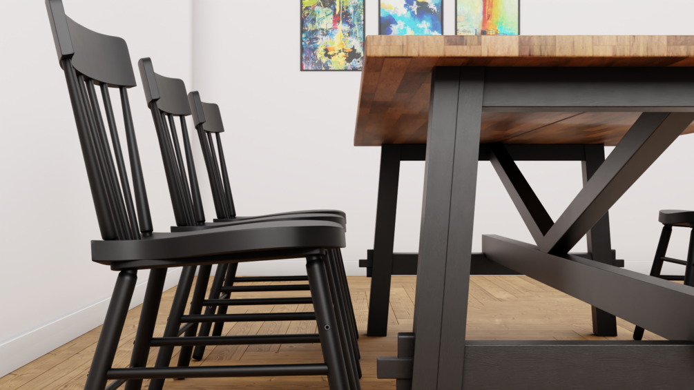 Large Textures, wood (4K Resolution). Hue Saturation Value changed on the table structure to resemble black wood. Basic material used for black chair.